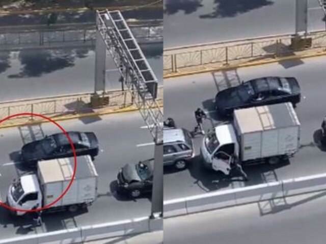 Transeúntes registraron cómo el camión que transportaba computadoras portátiles fue interceptado por tres vehículos de los que bajaron delincuentes armados y redujeron al conductor, despachador e incluso a los dos policías en retiro, encargados de la custodia de la mercadería, quienes iban a bordo del auto rojo.
