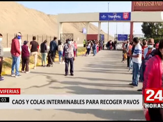 En la distribuidora de San Fernando en Surquillo hubo caos, los consumidores denunciaron que los pavos de 9 y 12 kilos se habían acabado. Mientras que en el Estadio Gudalupano en Los Olivos las colas se contaban por cuadras.