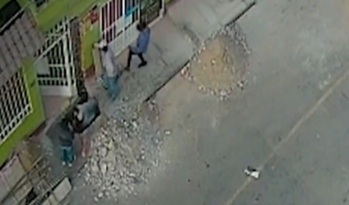 Cámaras de seguridad registraron el momento en que un grupo de trabajadores que realizaban un forado para instalar una columna en la vereda fueron sorprendidos por dos delincuentes quienes los amenazaron con un arma de fuego para robarles un 'rotomartillo'.