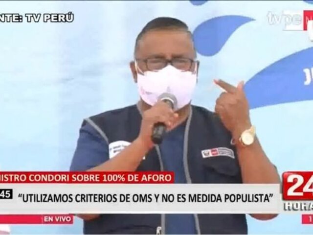 El ministro de Salud, Hernán Condori, se pronunció respecto a las criticas en su contra, debido a su propuesta de ampliar el aforo en espacios abiertos y cerrados al 100%. El titular del Minsa señaló que su iniciativa está respaldada por la OMS y descarta que sea una medida populista.