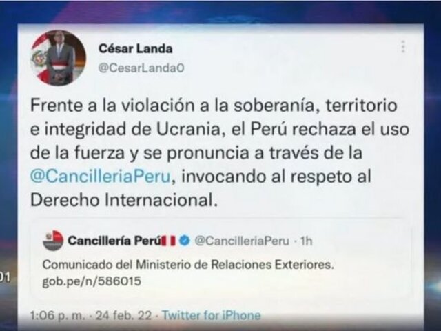 El Canciller de la República, César Landa, se pronuncio sobre el conflicto armado que viene ocurriendo entre las naciones de Rusia y Ucrania. A través de su cuenta de Twitter, el Canciller desaprobó el accionar del gobierno ruso al atacar a Ucrania.