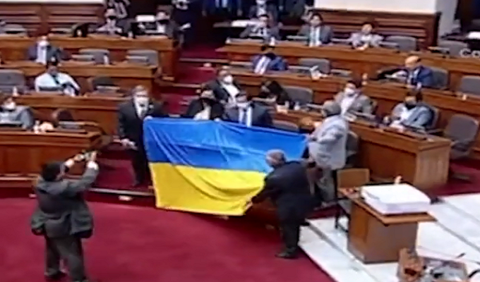 Mientras que, algunos congresistas desplegaron la bandera de Ucrania, sin embargo, fue retirada a pedido del oficial mayor del Parlamento.
