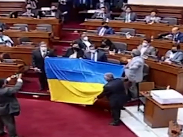 Mientras que, algunos congresistas desplegaron la bandera de Ucrania, sin embargo, fue retirada a pedido del oficial mayor del Parlamento.