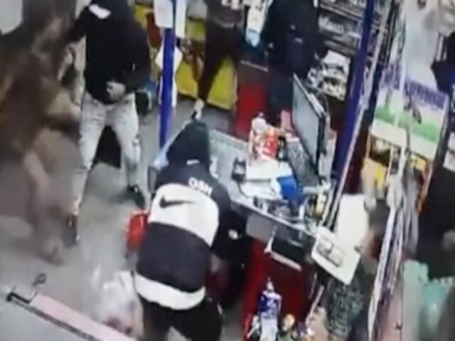 En los archivos de las cámaras de seguridad del minimarket, se puede apreciar cómo uno de los delincuentes que ingresó al recinto cubriéndose el rostro con una gorra negra. El sujeto desaparece de la escena y vuelve a mostrarse 10 segundos después con las manos llenas de productos.