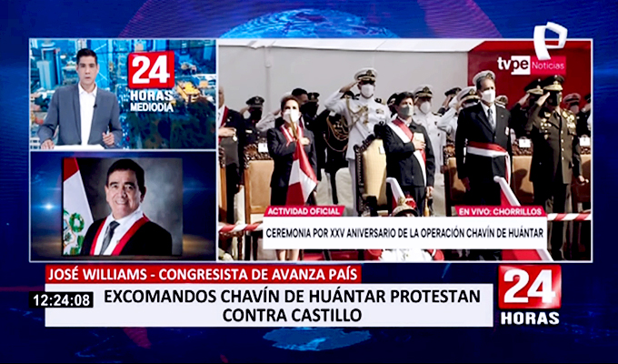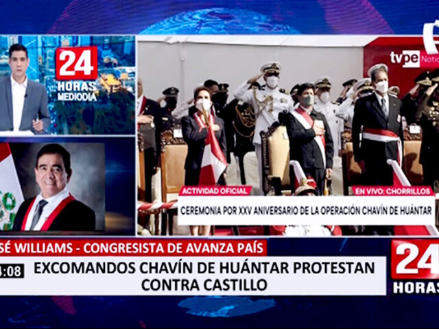 José Williams, congresista de Avanza País, conversó con Paco Flores para 24 Horas Mediodía sobre el desaire que el presidente Pedro Castillo recibió de varios ex comandos del reconocido Operativo Chavín de Huántar, quienes no dieron sus saludos al mandatario y, algunos, optaron por retirarse de la ceremonia.