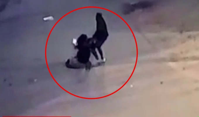 Cámaras de seguridad de la zona captaron a dos hampones que llegaban a bordo de una motocicleta, pero solo uno se bajó mientras el otro aguarda para escapar. Mientras que el otro delincuente va directamente a la cartera de la mujer.