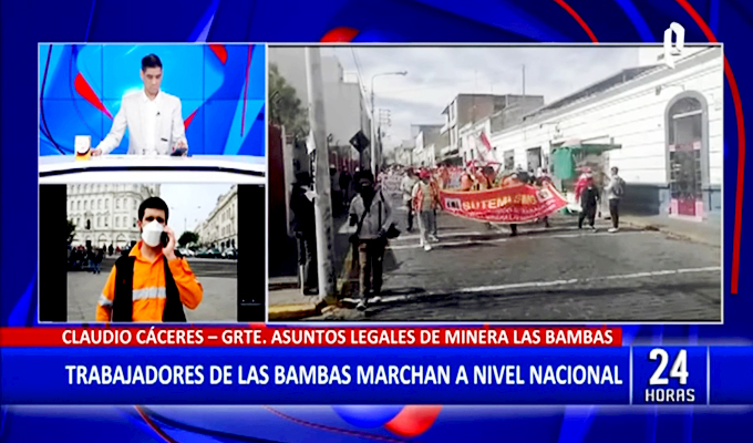 Los trabajadores de MMG Las Bambas nuevamente organizaron una marcha pacífica que se realizó de manera simultánea en Lima, Cusco y Arequipa, para exigir que se resuelva el conflicto que lleva más de 50 días sin solución. Claudio Cáceres, gerente Asuntos Legales de la empresa minera, conversó con Paco Flores para 24 Horas Mediodía respecto a la situación actual que afronta la empresa y sus trabajadores.