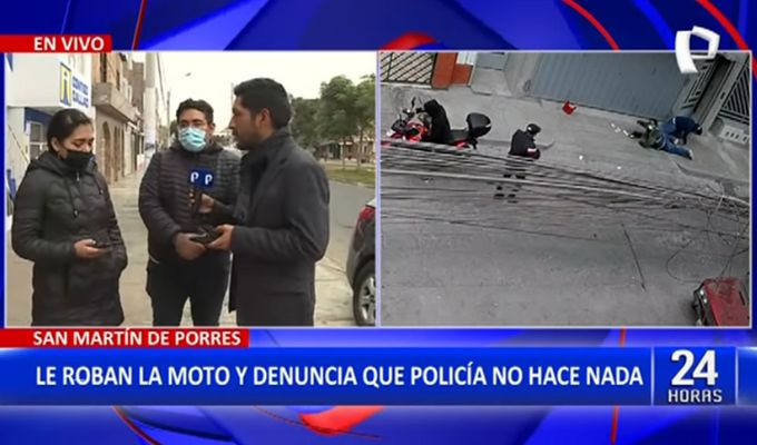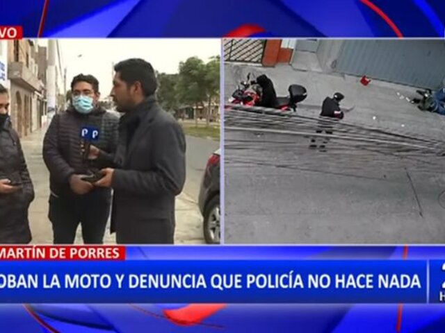 La delincuencia impera en Lima Norte. Un repartidor fue víctima de la inseguridad ciudadana luego que dos delincuentes con armas en mano, lo encañonaran para llevarse su motocicleta con rumbo desconocido. Lo más indignante fue que dos agentes del policía, quienes estaban a 1 cuadra del lugar de los hechos, se negaron a perseguirlos.