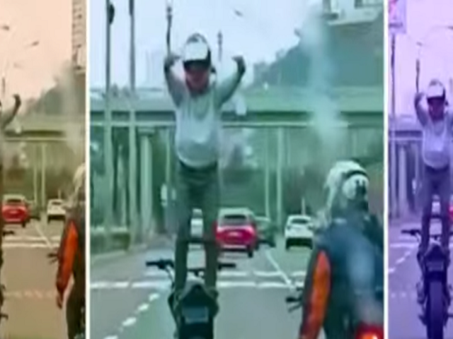 Una ciudadana grabó desde su celular el momento en el que uno de ellos invade el carril del centro y baja la velocidad de la moto, segundos después se ve al otro sujeto apoyarse sobre él para pararse encima de la unidad en movimiento, pese a que sabía que lo estaban grabando él se quedó varios segundo en esa posición haciendo señas vulgares a la conductora.