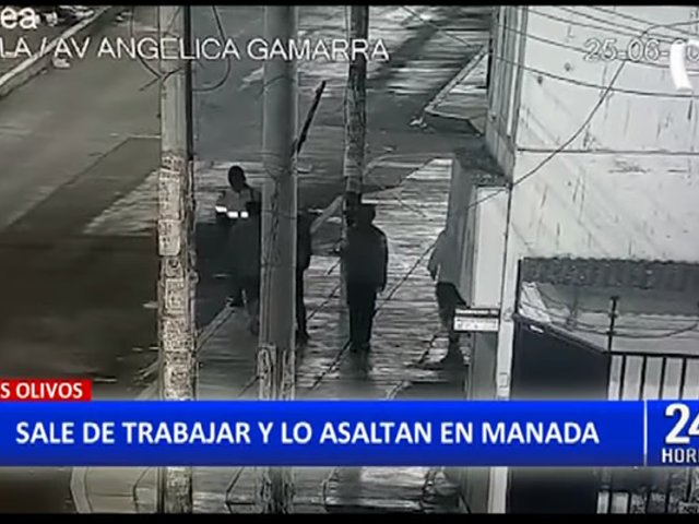 En una concurrida calle de Los Olivos, cámaras de video vigilancia captaron el preciso momento en la que un grupo de hampónes acorrala a un sujeto que salía de trabajar, para robarle sus pertenencias.