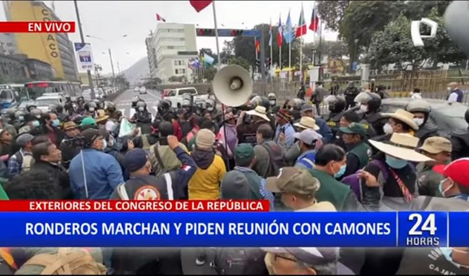 Un grupo de ronderos de diversas regiones del interior del país se hicieron presentes en las afueras del Congreso de la República, exigiendo conversar con la titular del Parlamento, Lady Camones (APP), con el objetivo de aprobar algunas leyes impulsadas por ellos.