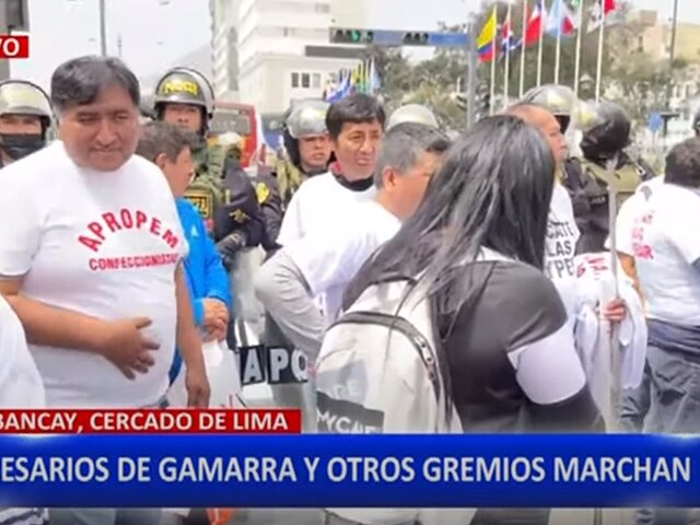 Cientos de comerciantes del emporio comercial de Gamarra vienen realizando una marcha de protesta por la avenida Abancay con dirección al Congreso de la República y Palacio de Gobierno. Distintos grupos empresariales y asociaciones de comerciantes de esa zona comercial piden al Poder Ejecutivo mayor apoyo al sector y activar la economía para no quebrar sus negocios.