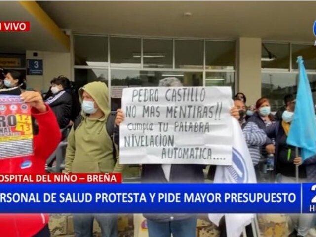 En el distrito de Breña, personal del sector salud viene realizando una protesta en las afueras del Hospital del Niño, exigiendo al gobierno de Pedro Castillo mayor presupuesto, pues aseguran que tanto el hospital en mención como otros centros médicos se encuentran en estado de precariedad.