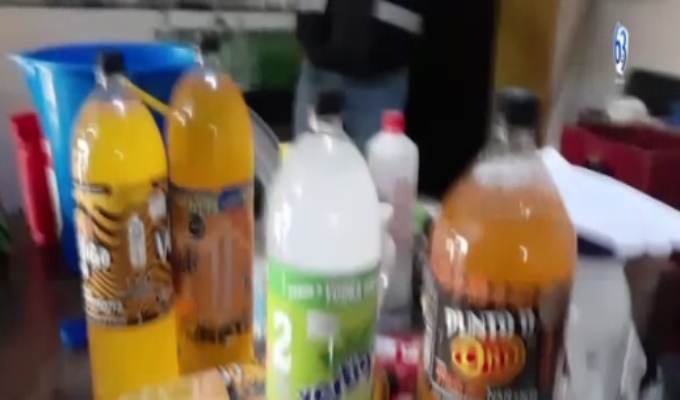 Durante un operativo, agentes de serenazgo y la policía encontraron al interior de un local decenas de botellas llenas de alcohol industrial y sustancias peligrosas listas para ser vendidas.