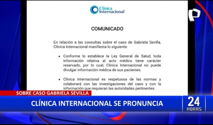 Clínica Internacional se pronuncia sobre caso Gabriela Sevilla