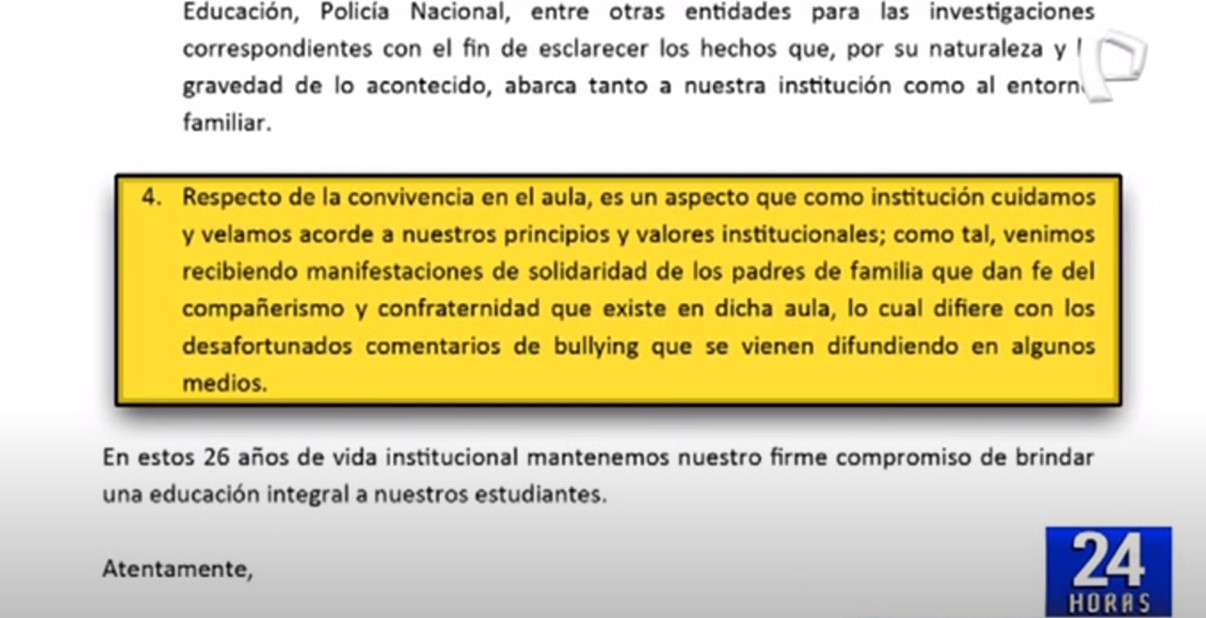 “Como institución cuidamos y velamos acorde a nuestros principios y valores institucionales; como tal, venimos recibiendo manifestaciones de solidaridad de los padres de familia que dan fe del compañerismo y confraternidad que existe en dicha aula, lo cual difiere con los desafortunados comentarios de bullying que se vienen difundiendo en algunos medios”, indicaron.