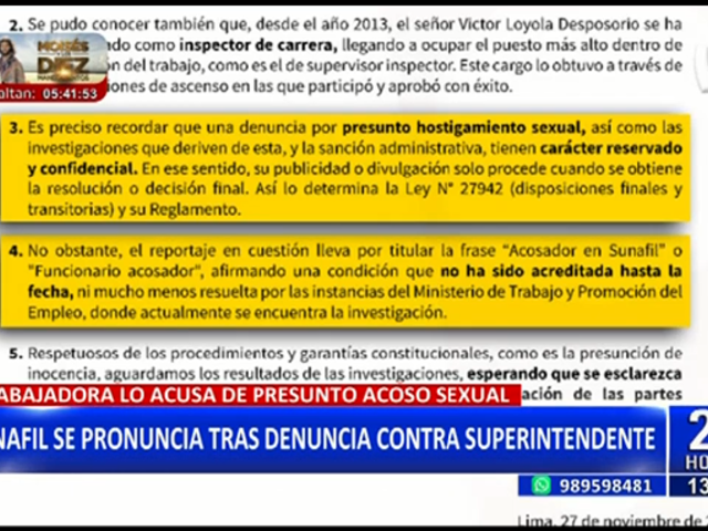 A través de un comunicado público la Superintendencia Nacional de Fiscalización Laboral (Sunafil), se refirió acerca de la denuncia contra el superintendente, por parte de una trabajadora, quien lo habría denunciado por presunto acoso sexual.