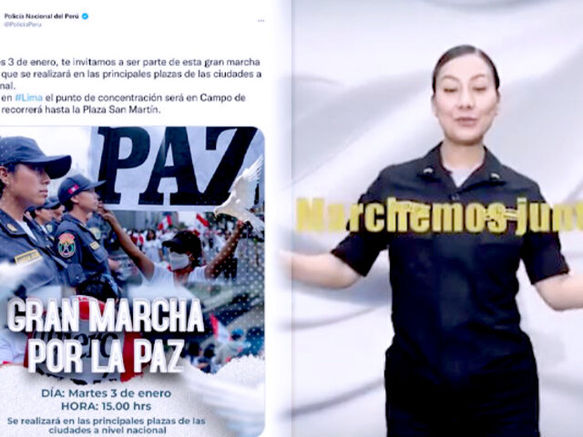 El 1 de enero también se difundió un video en que el mismo jefe de la Dirincri llamaba a la ciudadanía a participar. “Hermanos peruanos, te invitamos a la gran marcha nacional por la paz que se llevará a cabo este martes 3 de enero a las 3:00 p.m. en todo el Perú. En Lima será en el Campo de Marte. Ni una gota de sangre más, ni un peruano más herido, no a la violencia”, se le escucha decir.
