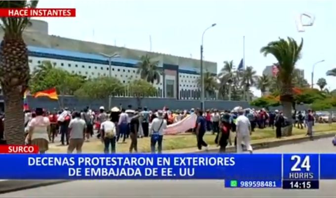 Una gran cantidad de manifestantes llegaron hasta los exteriores de la Embajada de los Estados Unidos, ubicada en el distrito de Surco, para alzar su voz de protesta y culpar a dicha Embajada norteamericana por la crisis política en nuestro país.