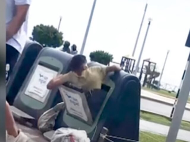 ¡No le temen a nada! Un reciclador fue captado arriesgando su vida al tratar de ingresar a contenedores de basura, que tiene hasta tres metros de profundidad, para sacar botellas y papeles en el distrito de San Miguel.