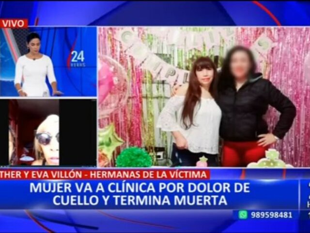 En declaraciones para 24 horas, la hermanas de la mujer fallecida, Esther y Eva Villón, indicaron que la mujer de 59 años acudió al centro médico Mevas en compañía de su pareja y fueron atendidos por un médico de nacionalidad venezolana, quien le aplicó las inyecciones a su hermana, las cuáles habrían acabado con su vida.