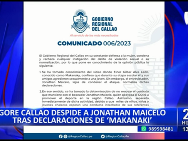 A través de un comunicado, el Gobierno Regional del Callao se pronunció acerca de la controversial entrevista que realizó el boxeador Jonathan Maicelo, al cómico conocido como “Makanaky”, quien habría confesado haber participado de una agresión sexual contra una mujer.