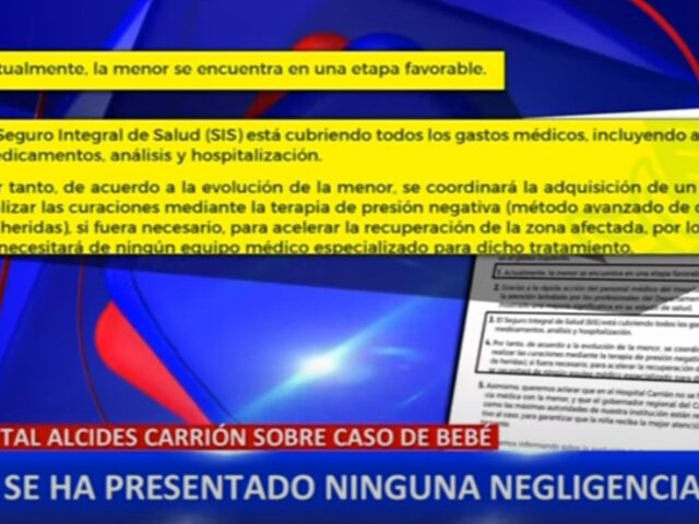Luego de que una madre denunciara una presunta negligencia médica contra su bebé de 10 meses de nacida, el cual tuvo como consecuencia que perdiera el 50% de su glúteo, el Hospital Alcides Carrión, del Callao, emitió un comunicado señalando que “la menor se encuentra en una etapa favorable” y que el SIS está cubriendo todos los gastos.