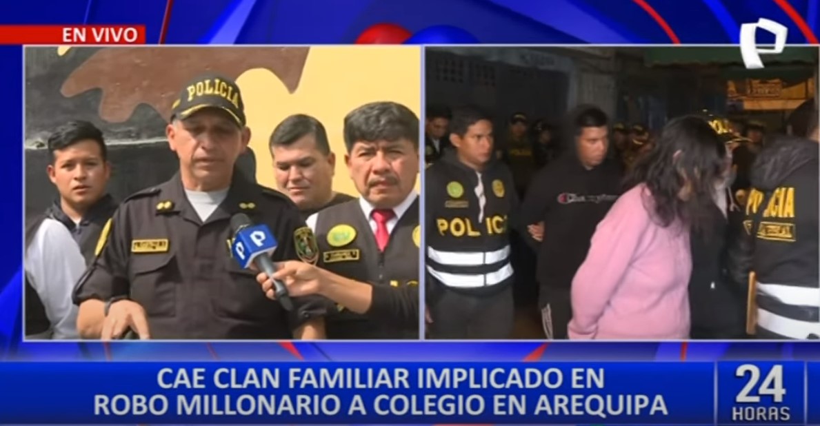 Agentes de la Policía Nacional logró la detención de 11 personas integrantes de un clan familiar quienes estarían implicados en un millonario robo a un colegio de la ciudad de Arequipa, hecho ocurrido en el año 2020, donde se conoció que la banda se llevó 1 millón 80 mil soles de las cuentas bancarias de la Institución Educativa.