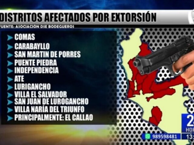 De acuerdo a un informe de la Asociación de Bodegueros, son 22 mil los comerciantes que son extorsionados a nivel nacional, de los cuales el 98% se encuentra en Lima específicamente en zonas donde la criminalidad ha incrementado.