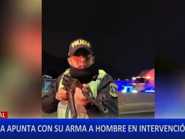 En las imágenes se puede apreciar como el efectivo policial lo apunta al conductor con su rifle AKM, luego que este le pidiera sus documentos de portar licencia de arma, pese a que el conductor le decía que los tiene de manera digital.