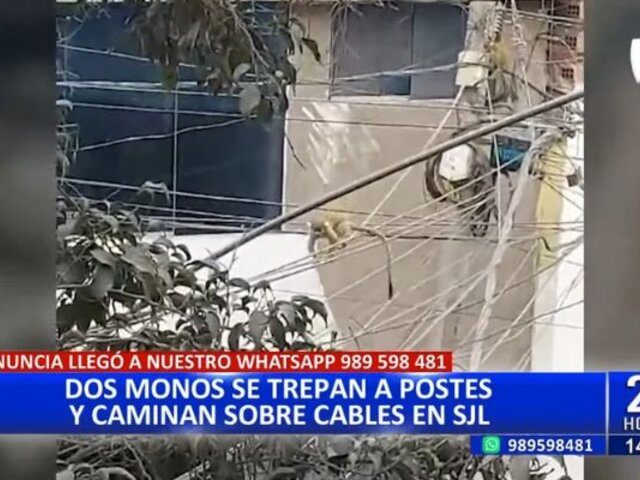 A través de nuestro WhatsApp de denuncias, vecinos de la zona 8 de octubre del distrito de San Juan de Lurigancho, reportaron la presencia de dos monos que vienen trepando postes y caminando sobre los cables de luz.
