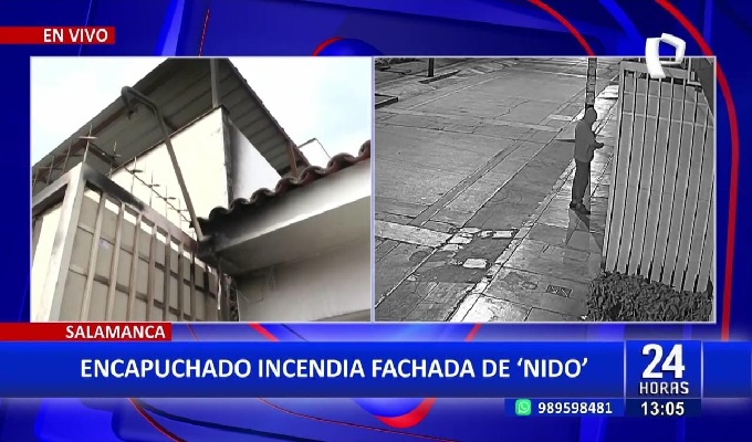 Confuso incidente. Las cámaras de seguridad captaron cómo un sujeto que transitaba a altas horas de la noche cerca de un nido, vierte un líquido e incendia la fachada de la institución ubicada en Salamanca.