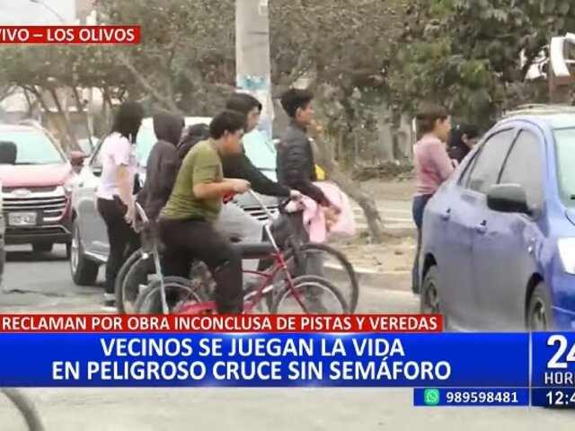 Vecinos de la avenida Dos de Octubre con calle Santa Elmira, en Los Olivos, denunciaron a través de las cámaras de 24 Horas que exponen sus vidas al tener que sortear a los vehículos para cruzar una avenida, a este panorama se suma a una obra inconclusa de pistas y veredas que, según informaron, le compete a la municipalidad de Lima.