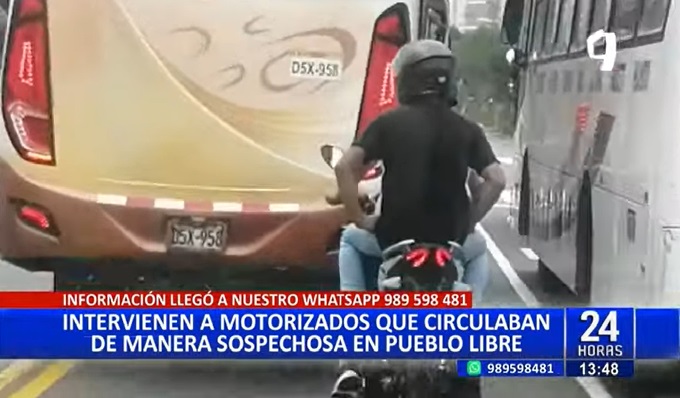 Movimientos sospechosos. A través del WhatsApp de denuncias de 24 Horas Mediodía, llegaron imágenes en donde se puede apreciar la intervención de agentes de serenazgo de Pueblo Libre a dos ocupantes de una moto lineal quienes circulaban de manera sospechosa.