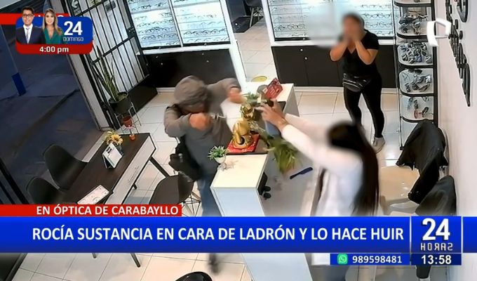 En el distrito de Carabayllo, la trabajadora de una óptica se salvó de ser víctima de la inseguridad ciudadana, luego que un delincuente ingresó a su centro de labores para asaltarla a ella y a su compañera de trabajo.