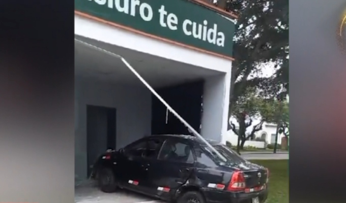 Una agente del serenazgo del distrito de San Isidro se salvó de milagro, luego de que un auto color negro se empotrara contra la mampara de vidrio del módulo ubicado en la avenida Javier Prado Oeste.