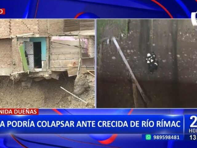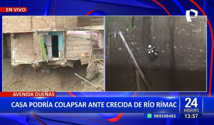 Ante el incremento registrado del caudal del Río Rímac, en la avenida Nicolás Dueñas, se ha reportado que una de las viviendas cercanas al denominado "Río Hablador" se encuentra a punto de colapsar.