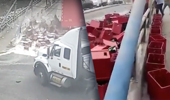 Un mal cálculo del conductor de un camión de carga ocasionó la caída de varias cajas con botellas de cerveza y la destrucción toda la mercadería.