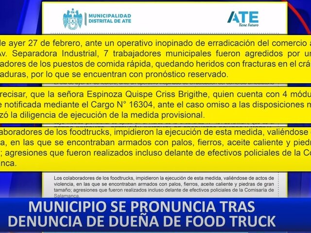 La Municipalidad Distrital de Ate se pronunció en relación con la denuncia de una emprendedora que afirmó que el personal de fiscalización le decomisó su herramienta de trabajo, un food truck, de manera violenta, a pesar de contar con una medida cautelar para trabajar en las inmediaciones de la Avenida Industrial.