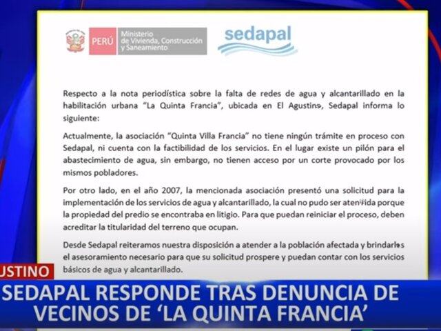 El Servicio de Agua Potable y Alcantarillado de Lima, (Sedapal), emitió un comunicado en respuesta a la denuncia presentada por los vecinos de "La Quinta Francia", ubicada en El Agustino. Estos vecinos señalaron la ausencia hasta la fecha de redes de agua y alcantarillado en su zona.