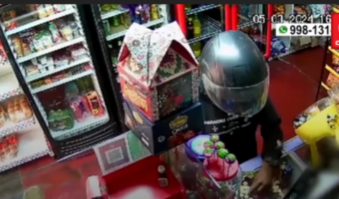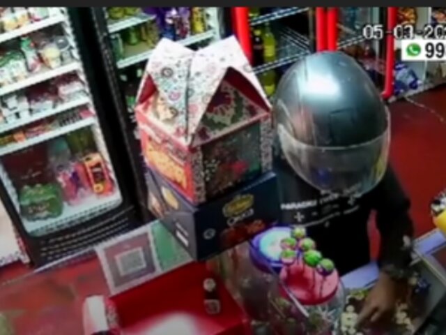 Este avezado ladrón llegó hasta el establecimiento a bordo de una motocicleta, estacionó la unidad y entró al minimarket haciéndose pasar como cliente, al ver que la víctima estaba sola no dudo en sacar su pistola.