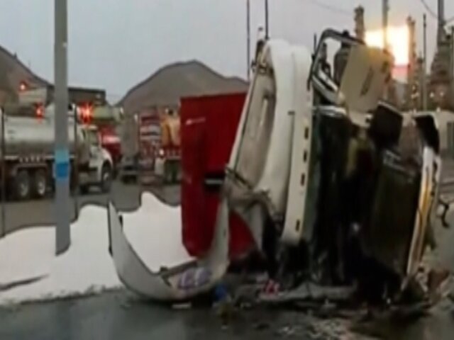 Un violento choque ocasionó que un camión volquete cargado de sal volcara en plena avenida Néstor Gambetta, en Ventanilla. Un volquete impactó contra un camión cisterna que trasladaba combustible, el cual terminó esparcido por varios metros en la vía.