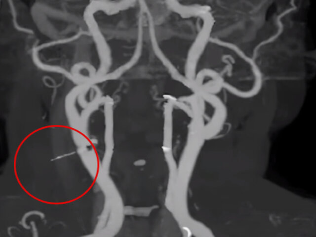 EL filudo objeto que tenía en su arteria carótida, se oxidó y puso en riesgo su vida por lo que tuvo que ser llevada al recinto de salud para que pueda recibir la atención necesaria.