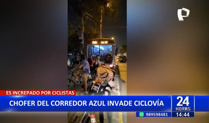 Un conductor del Corredor Azul fue increpado por un grupo de ciclistas en el Centro de Lima, luego de haber invadido la ciclovía en la que transitaban, con el fin de evadir el tráfico en horas de la noche.