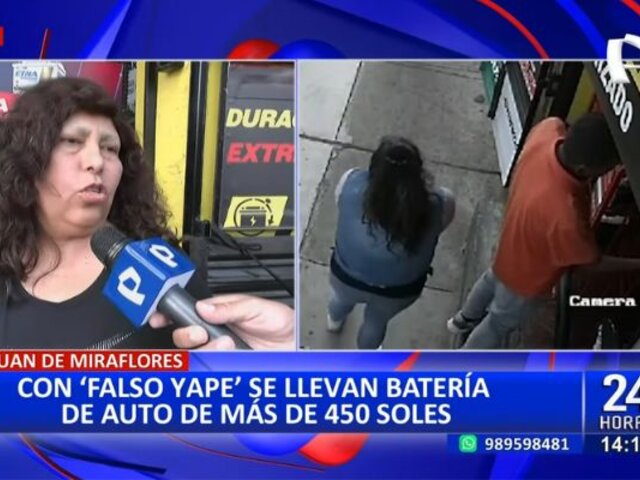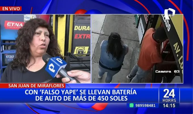 En declaraciones para 24 Horas Mediodía, la dueña de la tienda indicó que los facinerosos, un hombre y una mujer, llegaron hasta su negocio para pedir una batería de auto valorizada en más de 450 soles, y mostraron una imagen del supuesto pago a través de Yape.