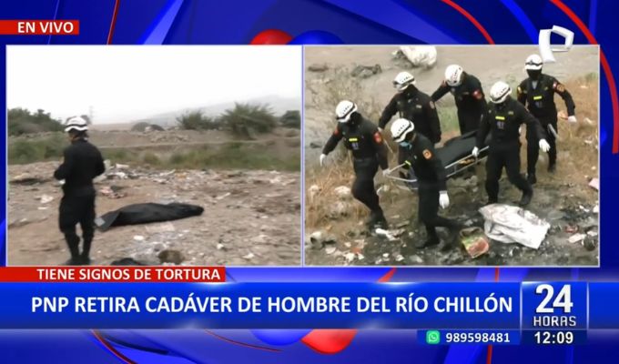 Personal de la División de Rescate de la Policía Nacional del Perú (PNP), llegó hasta las orillas del Río Chillón, para proceder con el retiro del cadáver hallado previamente por recicladores que suelen circular por dicho sector.