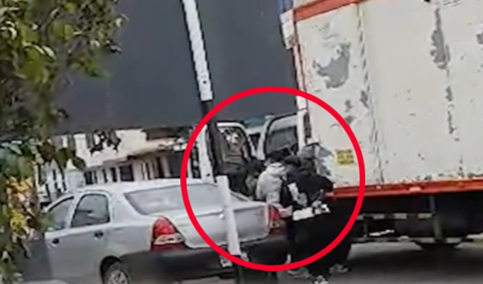 En las imágenes captadas por una mujer que en ese momento grababa un video de TikTok, se observa a los delincuentes, que iban a bordo de un auto, interceptar la unidad y bajar a la fuerza al conductor, quien es conducido al otro vehículo.