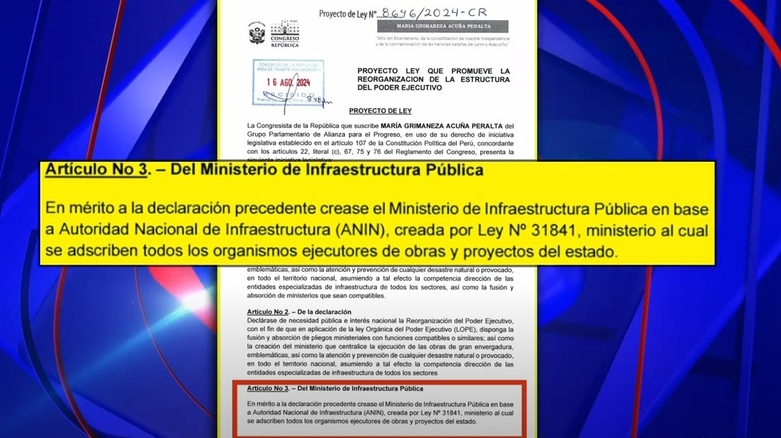El proyecto de ley N.° 8646/2024-CR propone que, “en mérito a la declaración procedente, se cree el Ministerio de Infraestructura Pública sobre la base de la Autoridad Nacional de Infraestructura, creada por la Ley N.° 31841, al cual se adscribirán todos los organismos ejecutores de obras y proyectos del Estado”.