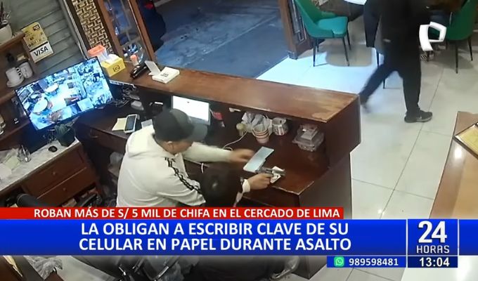 La dueña del chifa tampoco se salvó de los criminales, quienes la obligaron a escribir en un papel la clave de su teléfono celular. En total, los delincuentes se llevaron más de 5 mil soles entre dinero y objetos de valor.