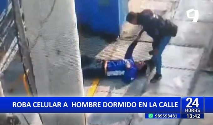 En el distrito de Miraflores, cámaras de seguridad registraron a un delincuente, quien aprovechó la vulnerabilidad de un sujeto que se había quedado dormido en la calle, para arrebatarle su teléfono celular.